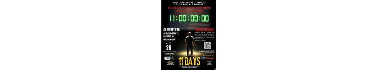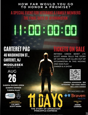 - 11 Days - August 26th, 2026 at the Carteret Performing Arts Center - Dinner & a Show 5PM doors open - Attention all veterans and supporters, we are pleased to announce that through the generosity of Braven Health, we are bringing in the show 11 Days. This play is written by and stars LTC (Ret) Scott Mann, a former Green Beret as he discusses the final 11 days of the longest war in American history, Afghanistan. He created TF Pineapple Express to try and get our allies out of Afghanistan before the Taliban came in and killed them all. This is a very riveting and emotional 1-man play that discusses the moral injury that so many veterans carry around with them. Dinner will be a delicious buffet meal featuring the best BBQ in New Jersey, Red White & Que smokehouse, a veteran owned business. Tickets are selling quickly so please scan the QR code on the attached flyer to buy your tickets today. Once it is sold out, it is sold out. So buy your tickets today. Everyone must see this show!