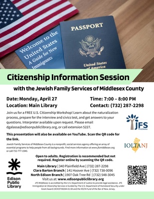 Join us for a FREE U.S. Citizenship Workshop! Learn about the naturalization process, prepare for the interview and civics test, and get answers to your questions. Interpreter available upon request. Please email dgalassa@edisonpubliclibrary.org, or call extension 5227.