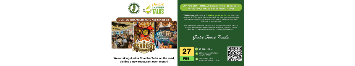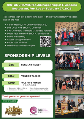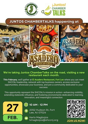 ¡Juntos! Chamber Talks event is happening on Friday, February 27th, 2026, from 10:00 AM to 12:00 PM at El Asadero Restaurant.
