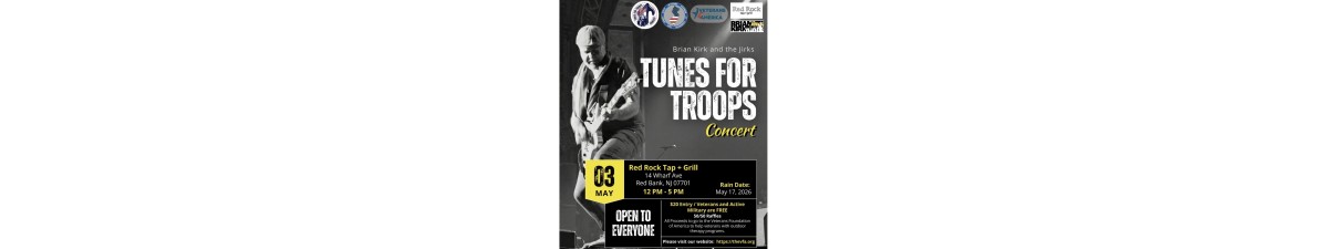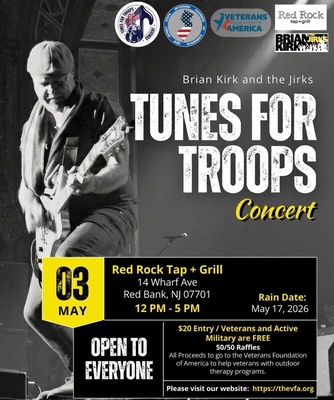 - Tunes 4 Troops Concert - Sunday May 3rd, 2026 - 12-5PM - Red Rock Bar & Grill, Red Bank, NJ - The amazing Brian Kirk & The Jirks will be playing this concert in support of our troops. Veterans and active military are free. All others $20 donation to the Veterans Foundation of America. Come celebrate with some awesome music, cold beer and a great time.